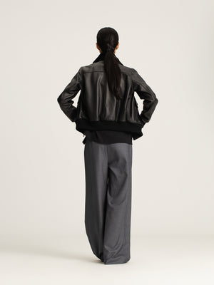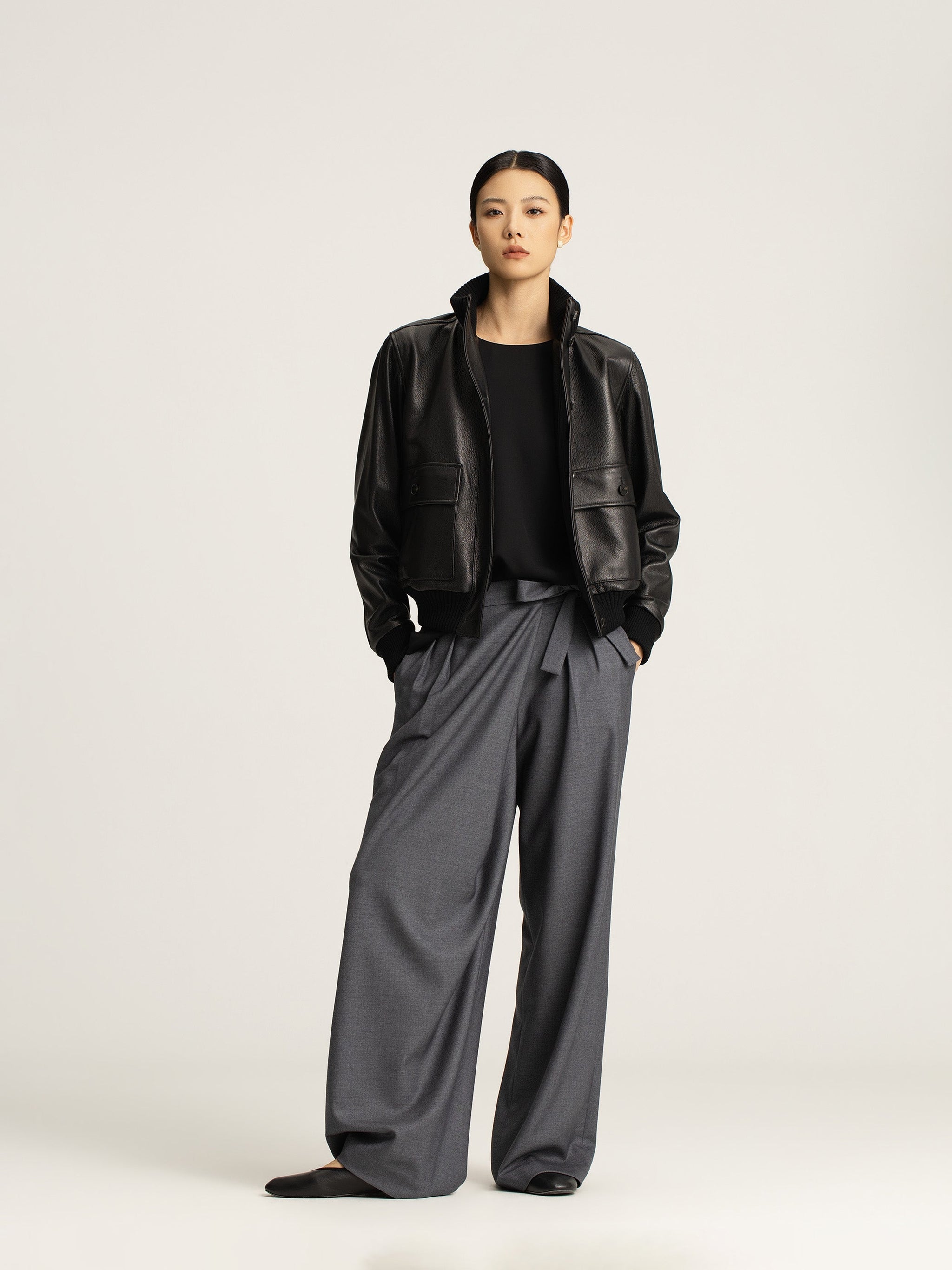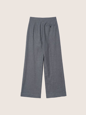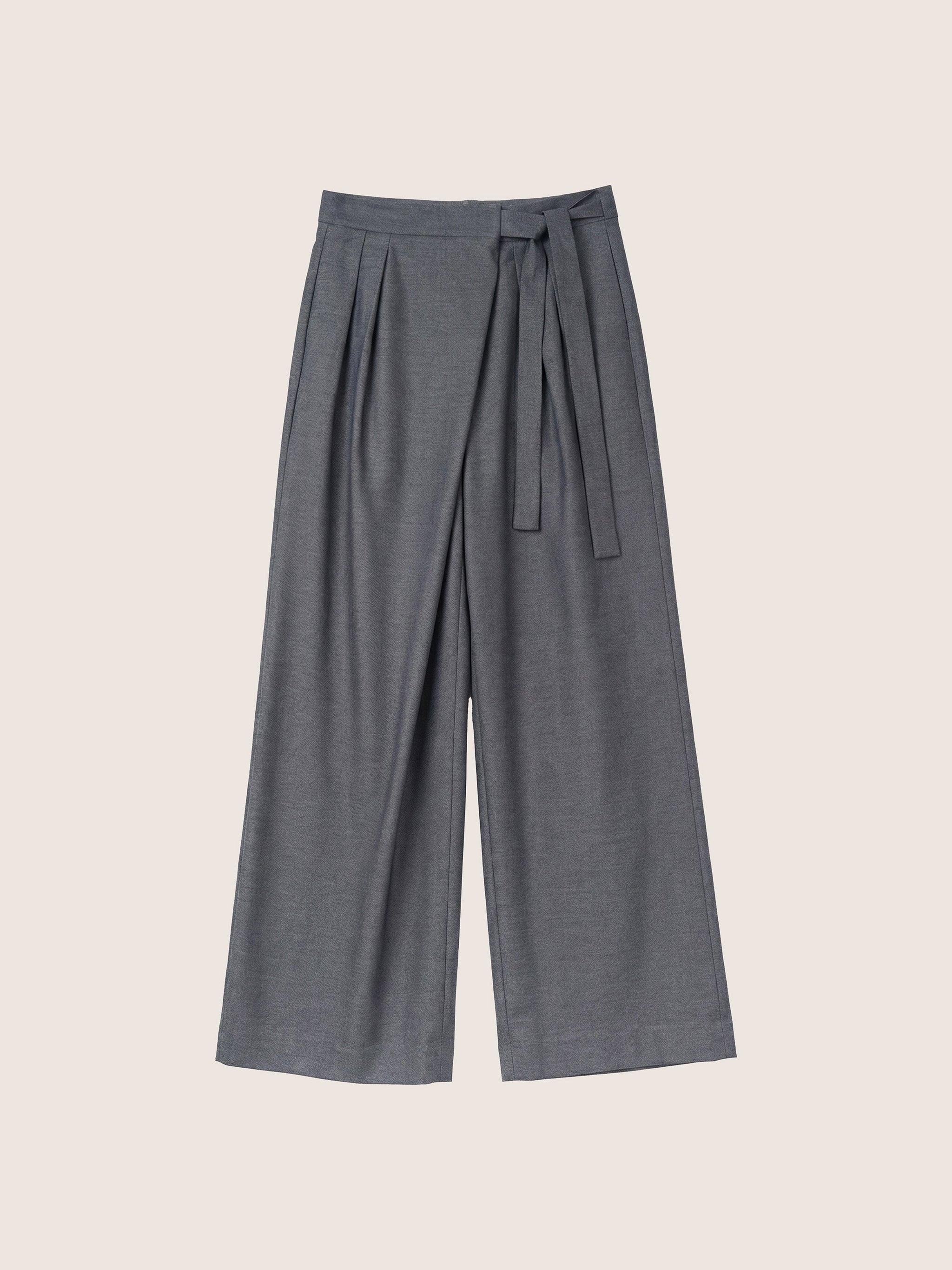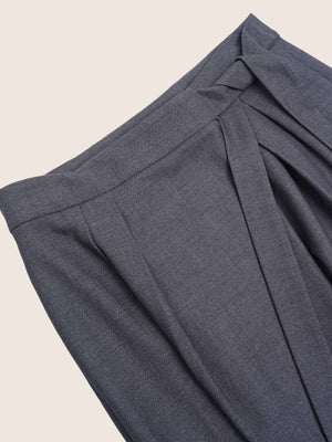 The impeccably chic Amira Wool Asymmetrical Pleated Trouser is cut from a fluid, mid-weight suiting fabric in versatile charcoal grey. The high-rise silhouette features a softly draped, slightly asymmetric wide leg and a self-tie detail that evokes a sophisticated wrap effect. Finished with front pleats, discreet side pockets, and a single rear welt pocket, this design balances structure and ease with refined simplicity.