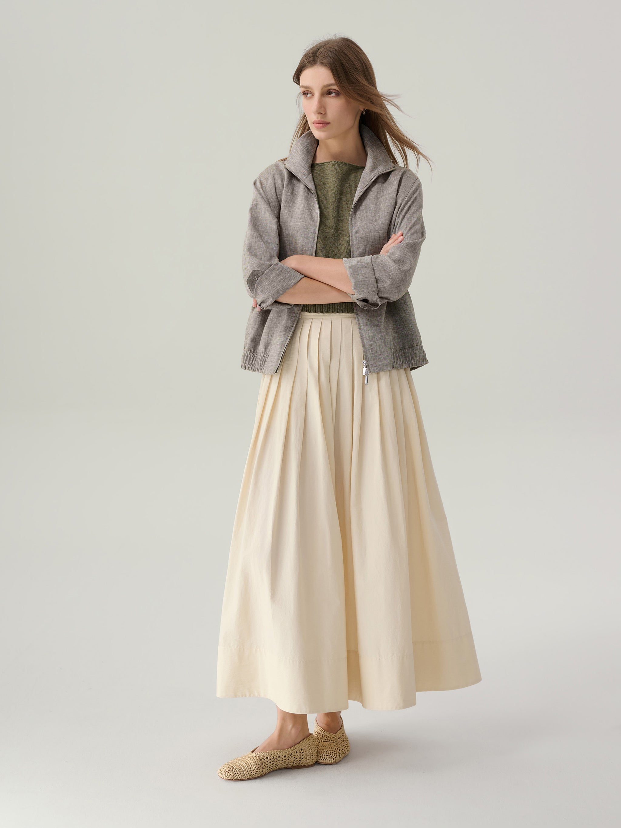 This thoughtfully blended knit combines the breathable softness of combed cotton with the airy texture of flax and the resilience of nylon. The result is a lightweight layer that feels fresh against the skin while offering gentle stretch and shape retention.