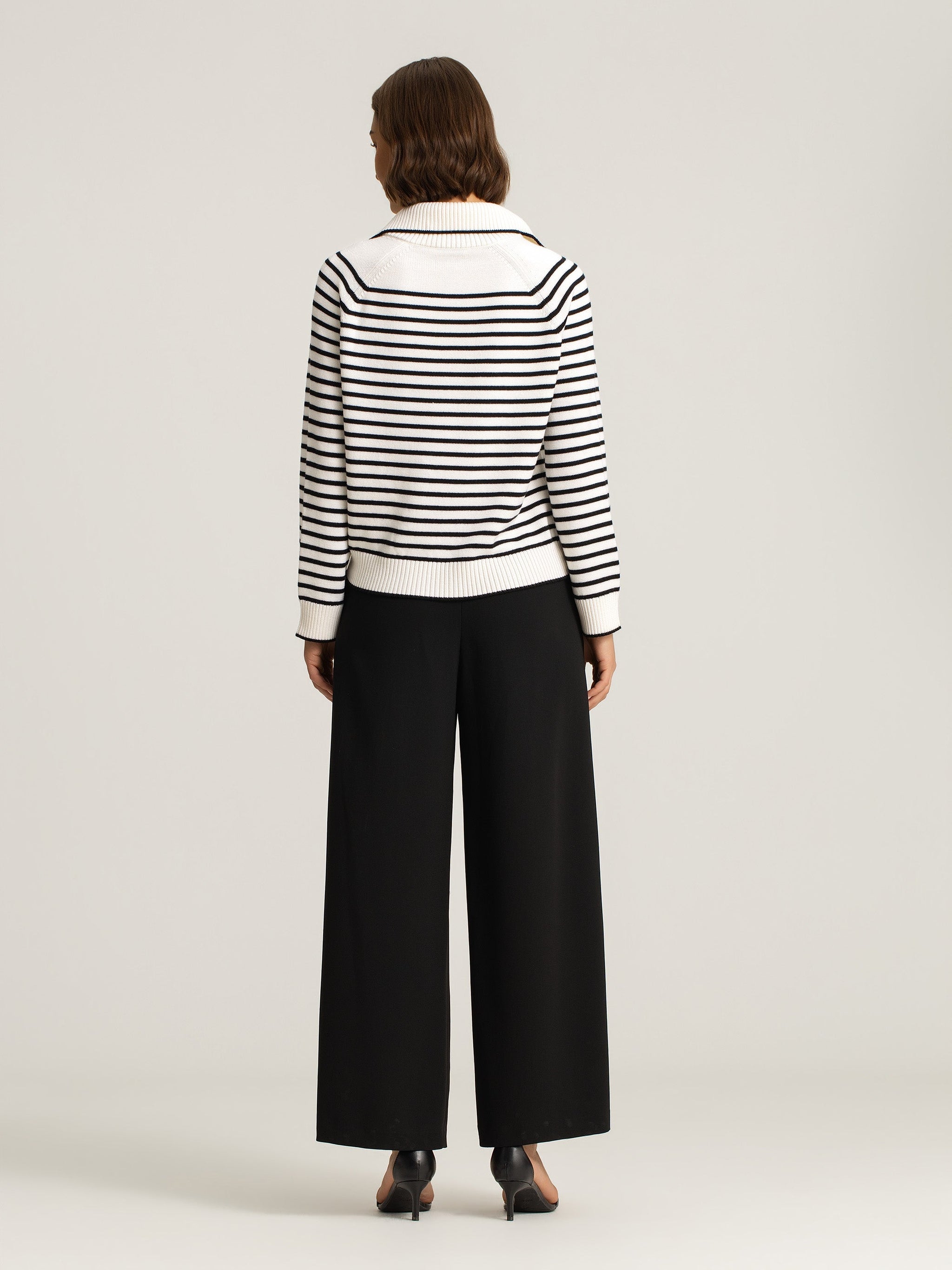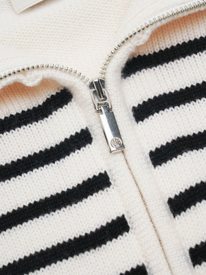 With a nod to nautical ease, the Ines Merino Stripe Quarter-Zip Knit is designed with classic black-and-ivory stripes in a softly structured silhouette. A wide ribbed collar and quarter-zip neckline bring understated versatility, while dropped shoulders and ribbed hems complete the cosy feel.