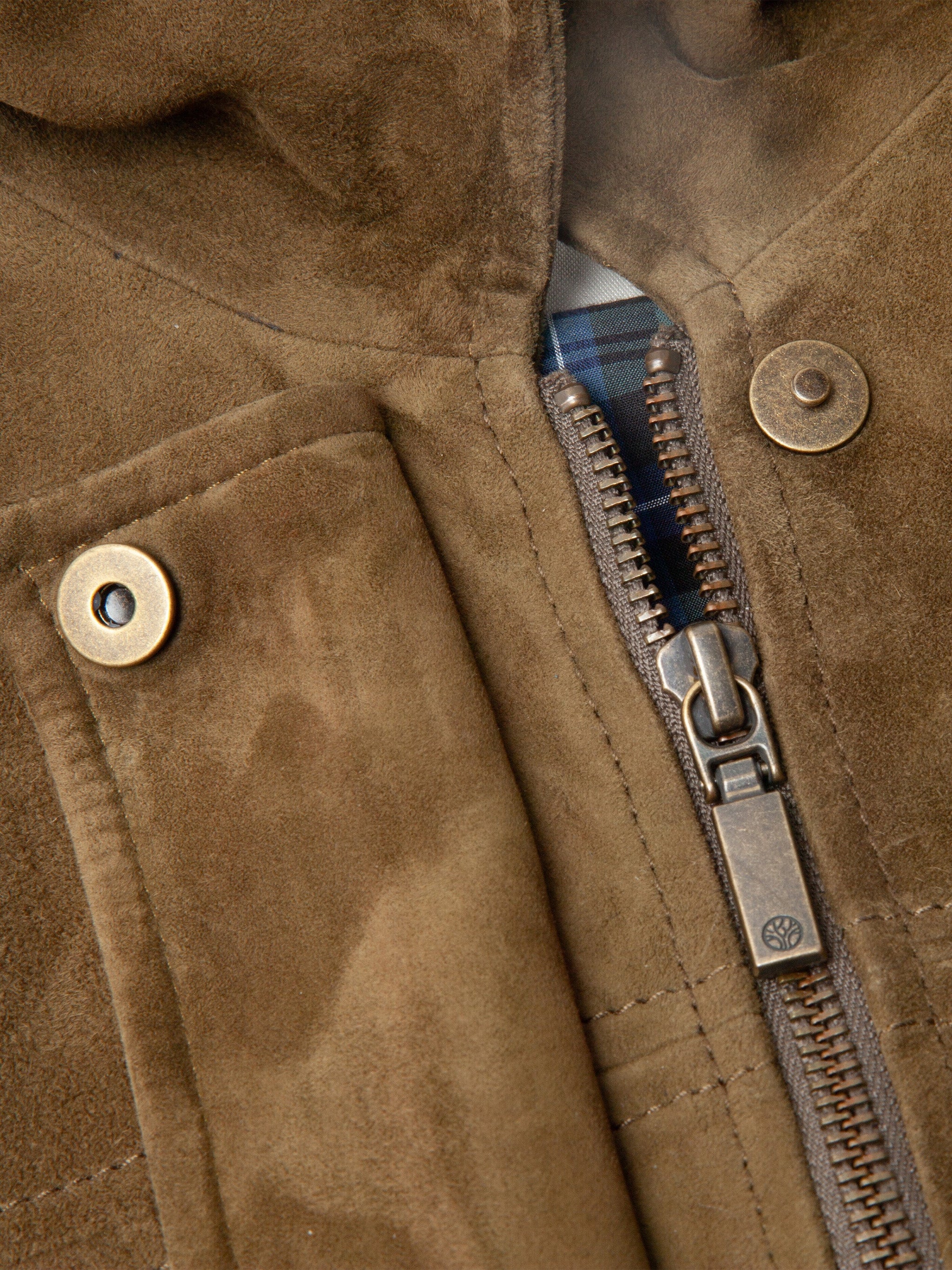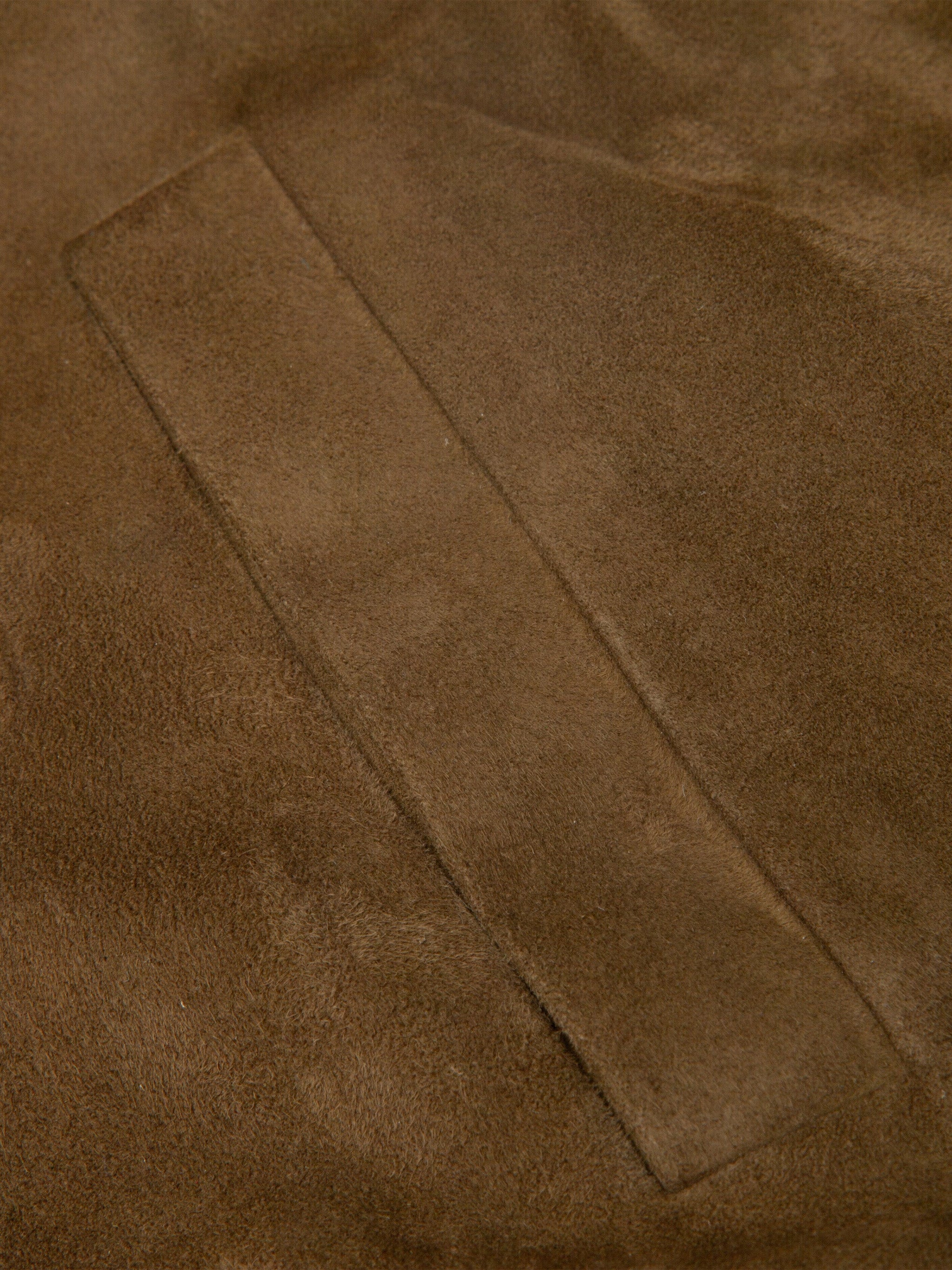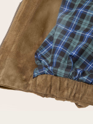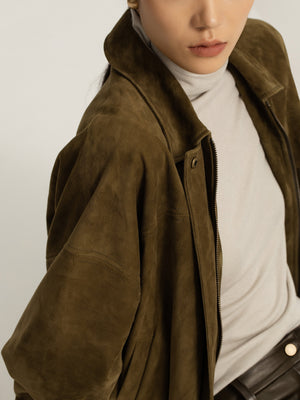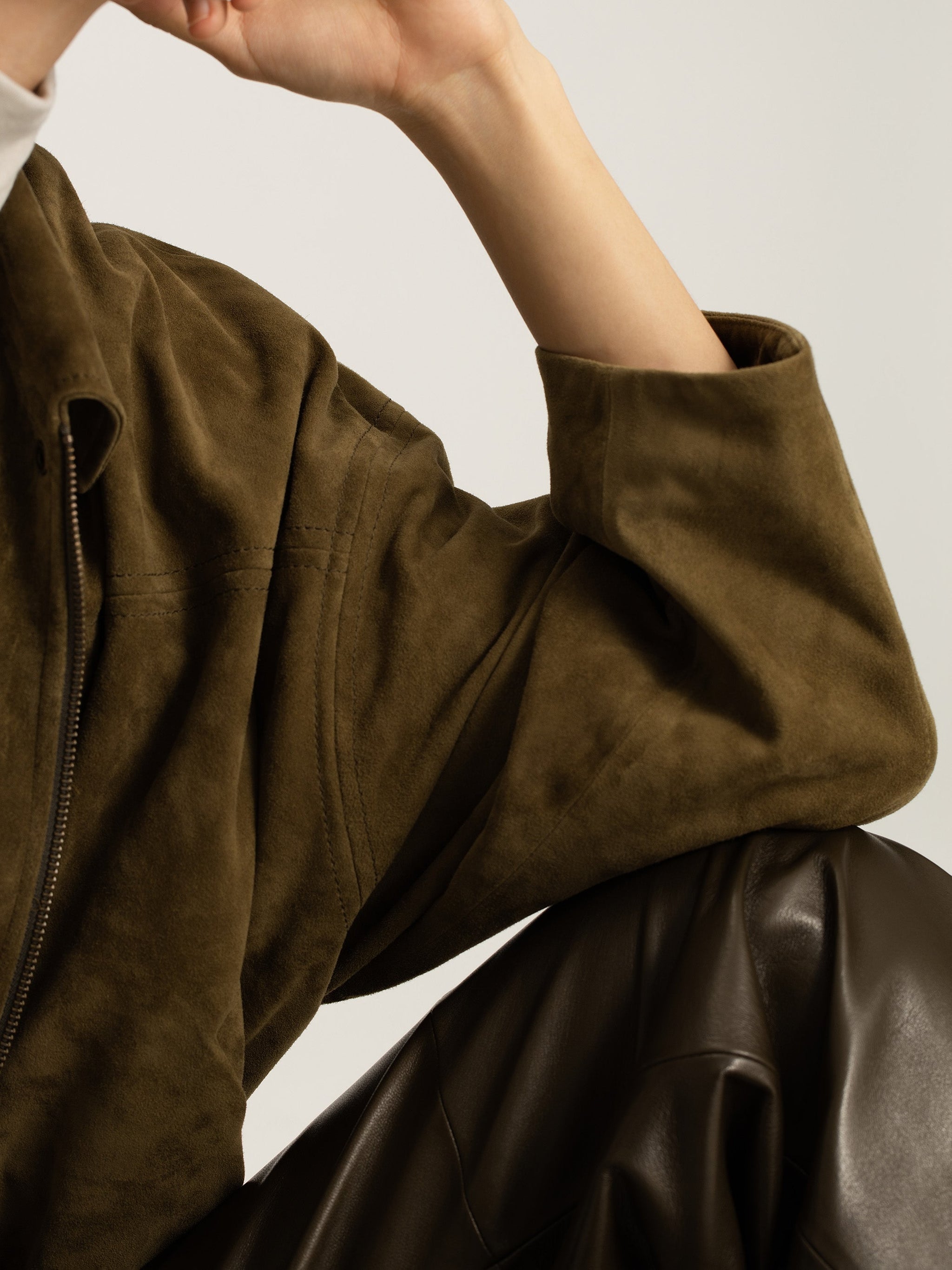 The Nico Suede Leather Jacket is cut from rich olive-toned suede in a relaxed, bomber-style silhouette. It features dropped shoulders, a stand collar, and an elasticated hem for casual ease. Roomy side pockets and a concealed zip-and-snap front closure add functionality and refinement. Fully lined in a soft plaid interior, it brings warmth and practicality to transitional dressing. Whether styled with formal trousers or laid-back denim, this piece moves seamlessly across seasons and settings.
