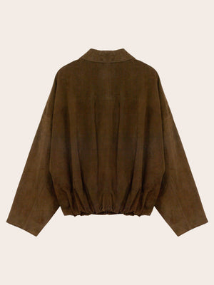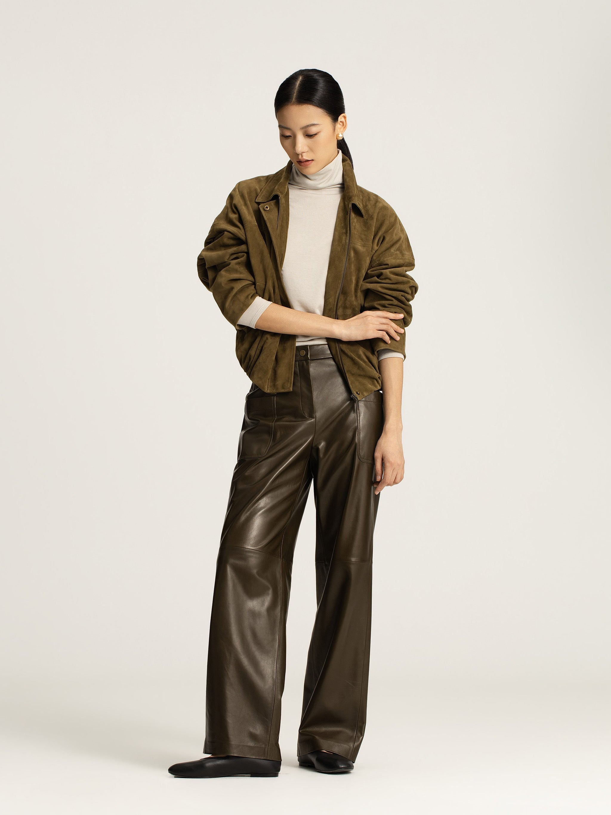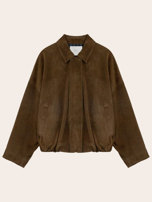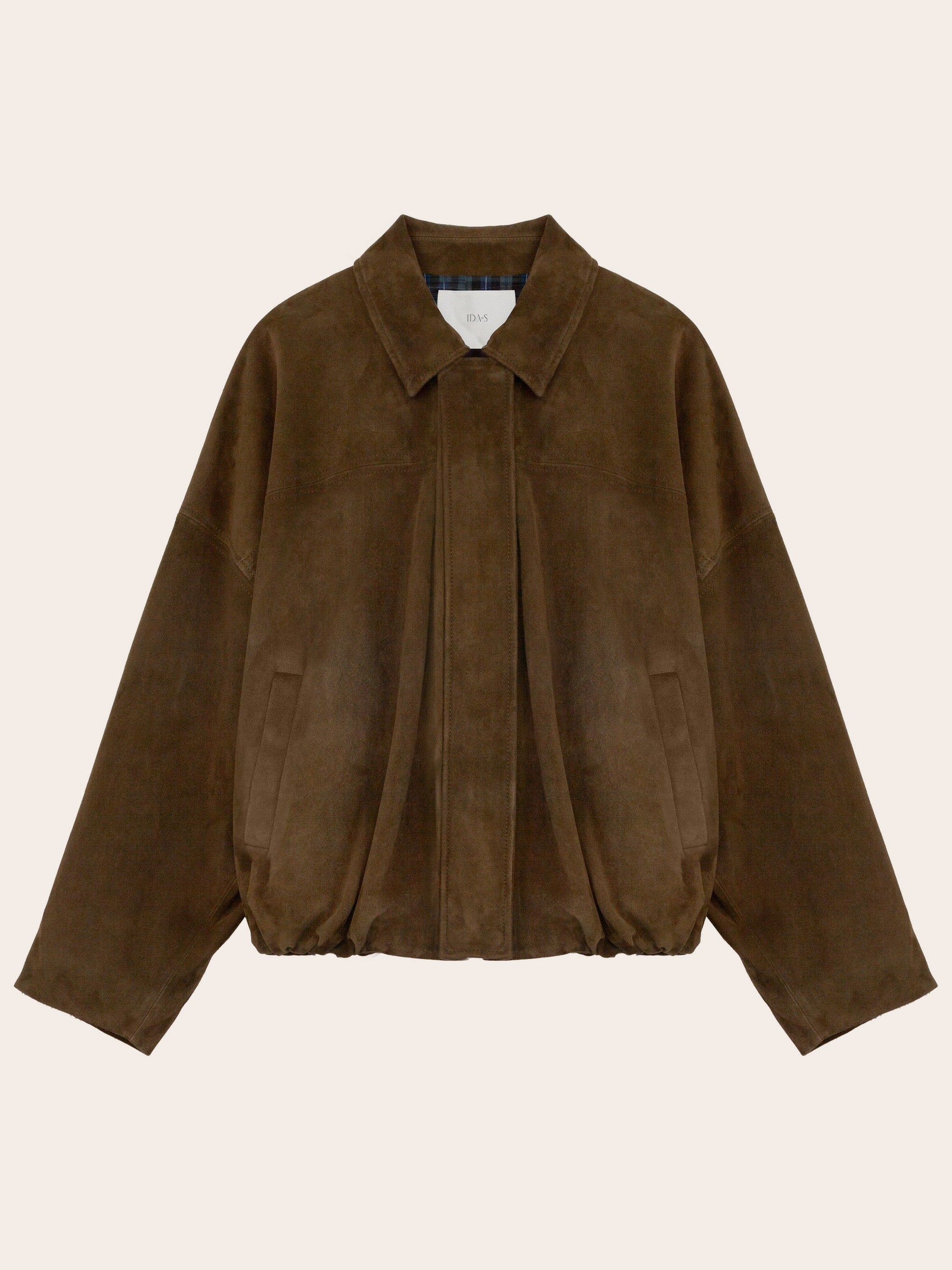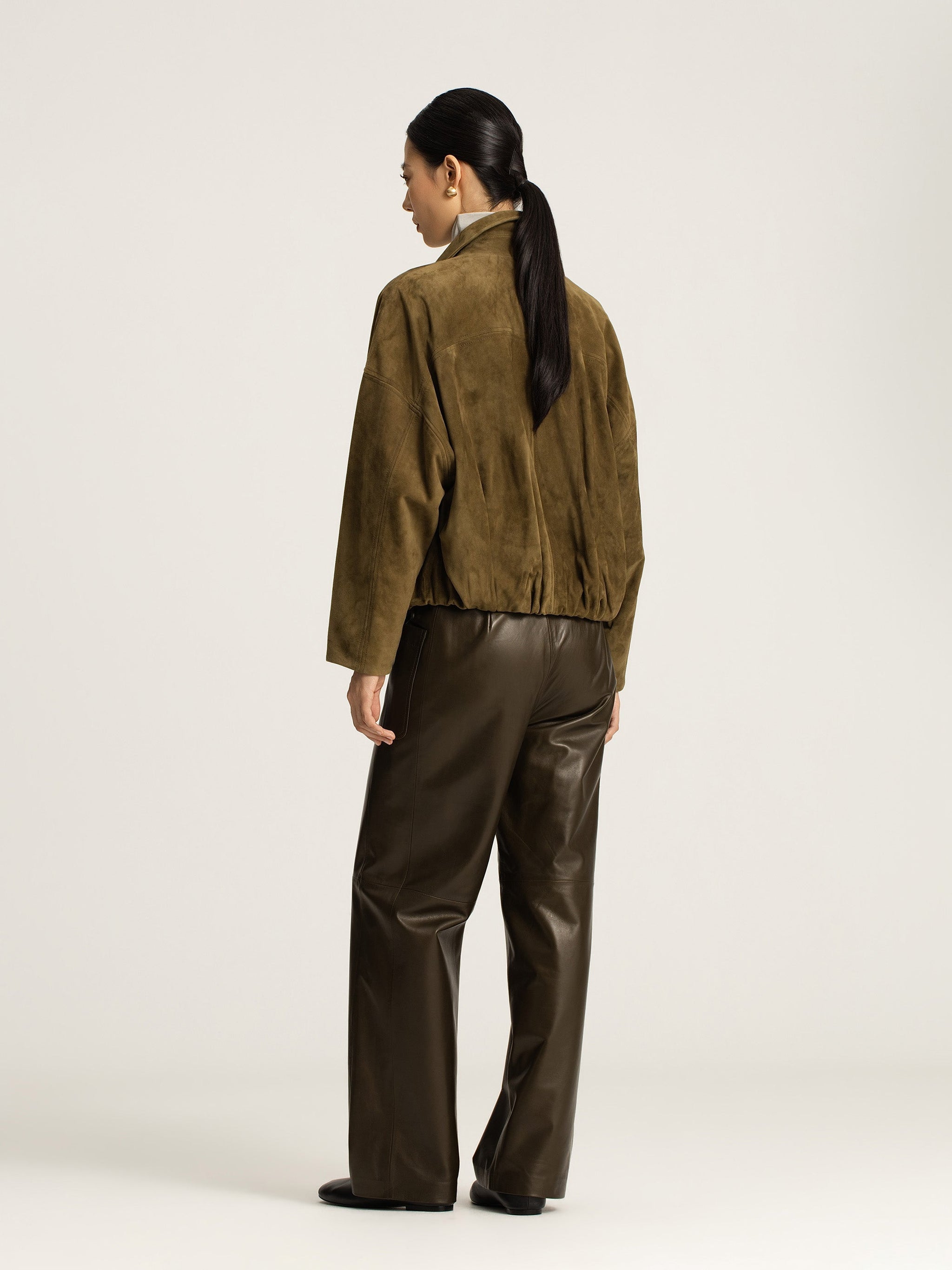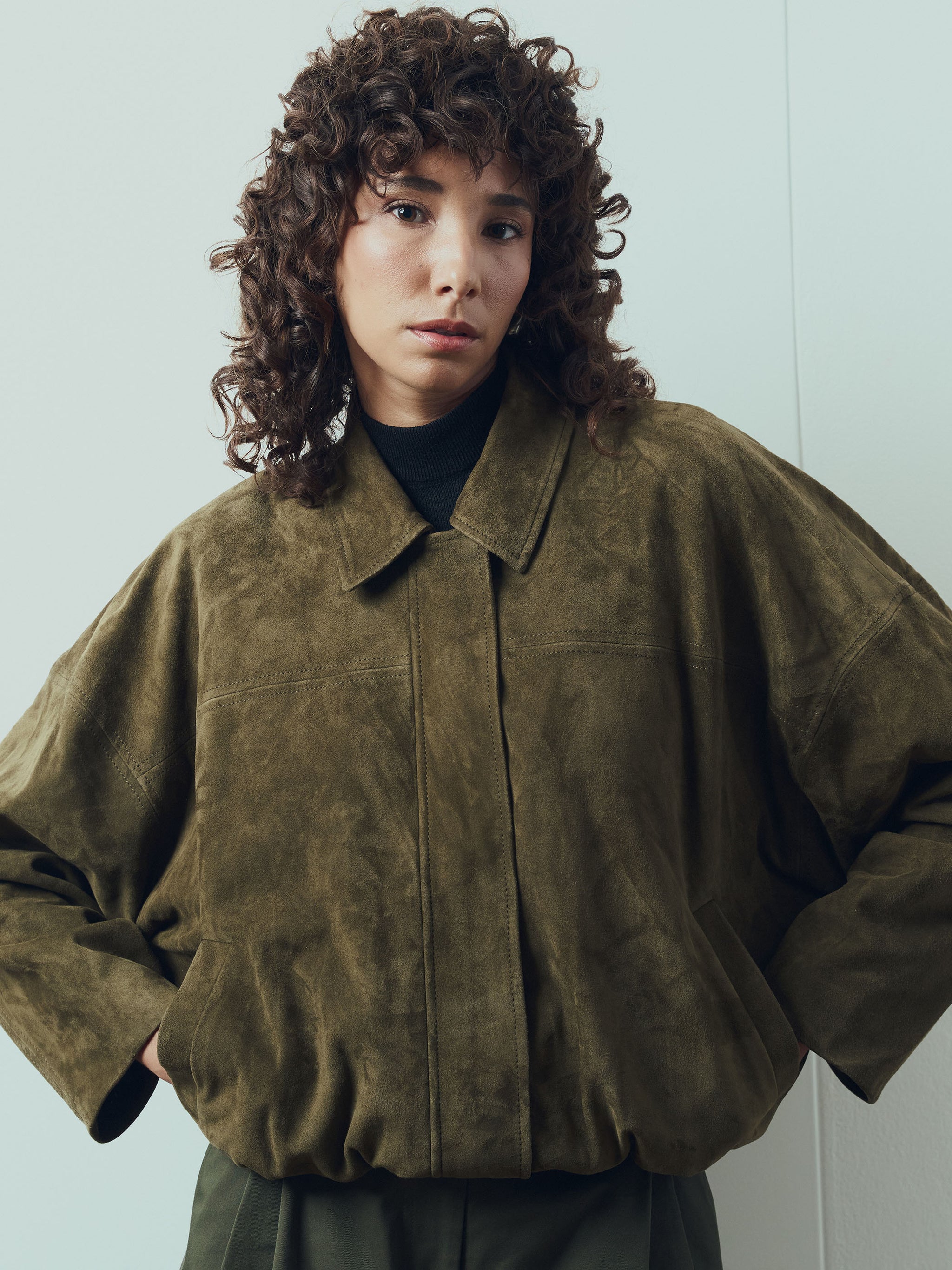 The Nico Suede Leather Jacket is cut from rich olive-toned suede in a relaxed, bomber-style silhouette. It features dropped shoulders, a stand collar, and an elasticated hem for casual ease. Roomy side pockets and a concealed zip-and-snap front closure add functionality and refinement. Fully lined in a soft plaid interior, it brings warmth and practicality to transitional dressing. Whether styled with formal trousers or laid-back denim, this piece moves seamlessly across seasons and settings.