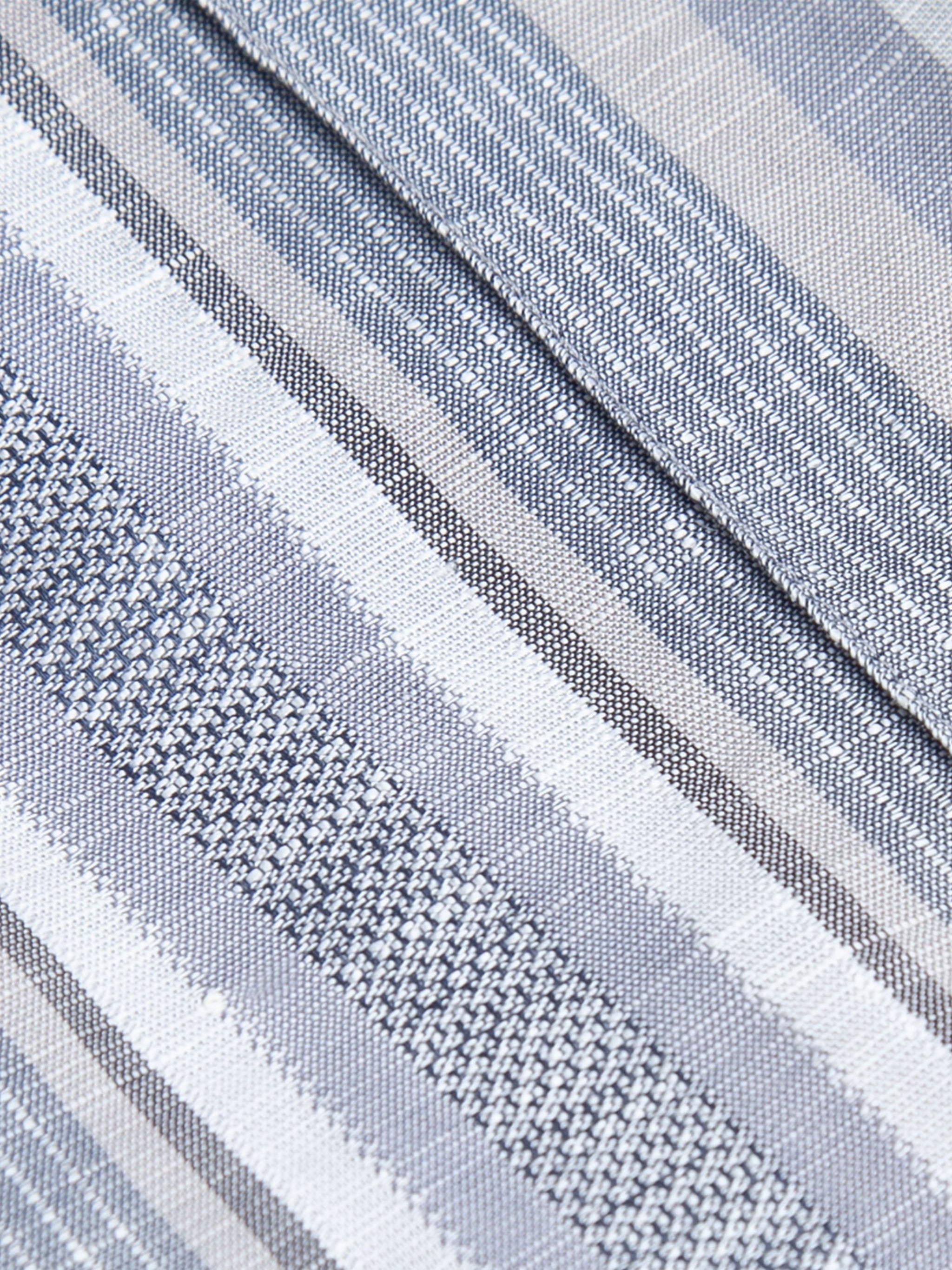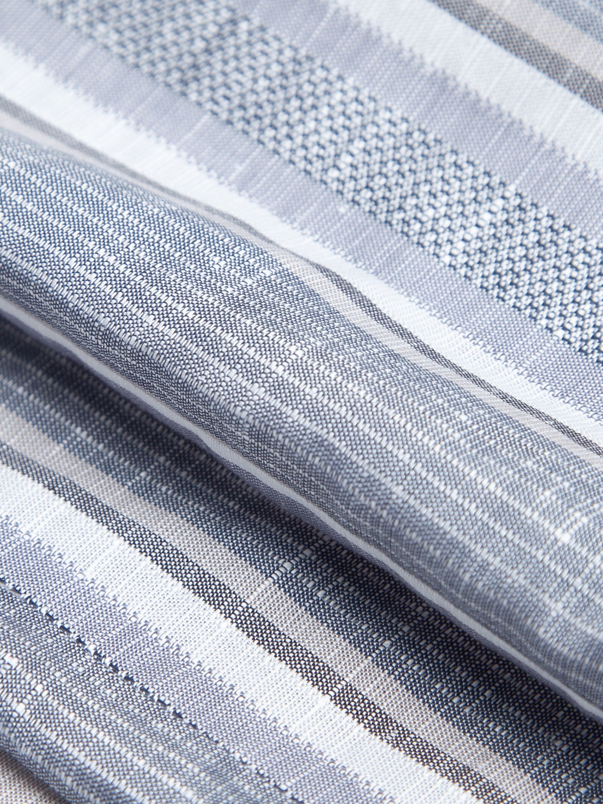 This fabric blends Lyocell and linen, balancing the silky softness and fluidity of Lyocell with the crisp, breathable qualities of linen. Naturally moisture-wicking and breathable, it ensures all-day comfort. The hand-dyed pinstripes in deep blue and white create a refined texture that reflects light beautifully. With Lyocell derived from renewable wood sources and linen grown as a low-impact crop, this fabric is not only luxurious to wear but also crafted in harmony with the environment.