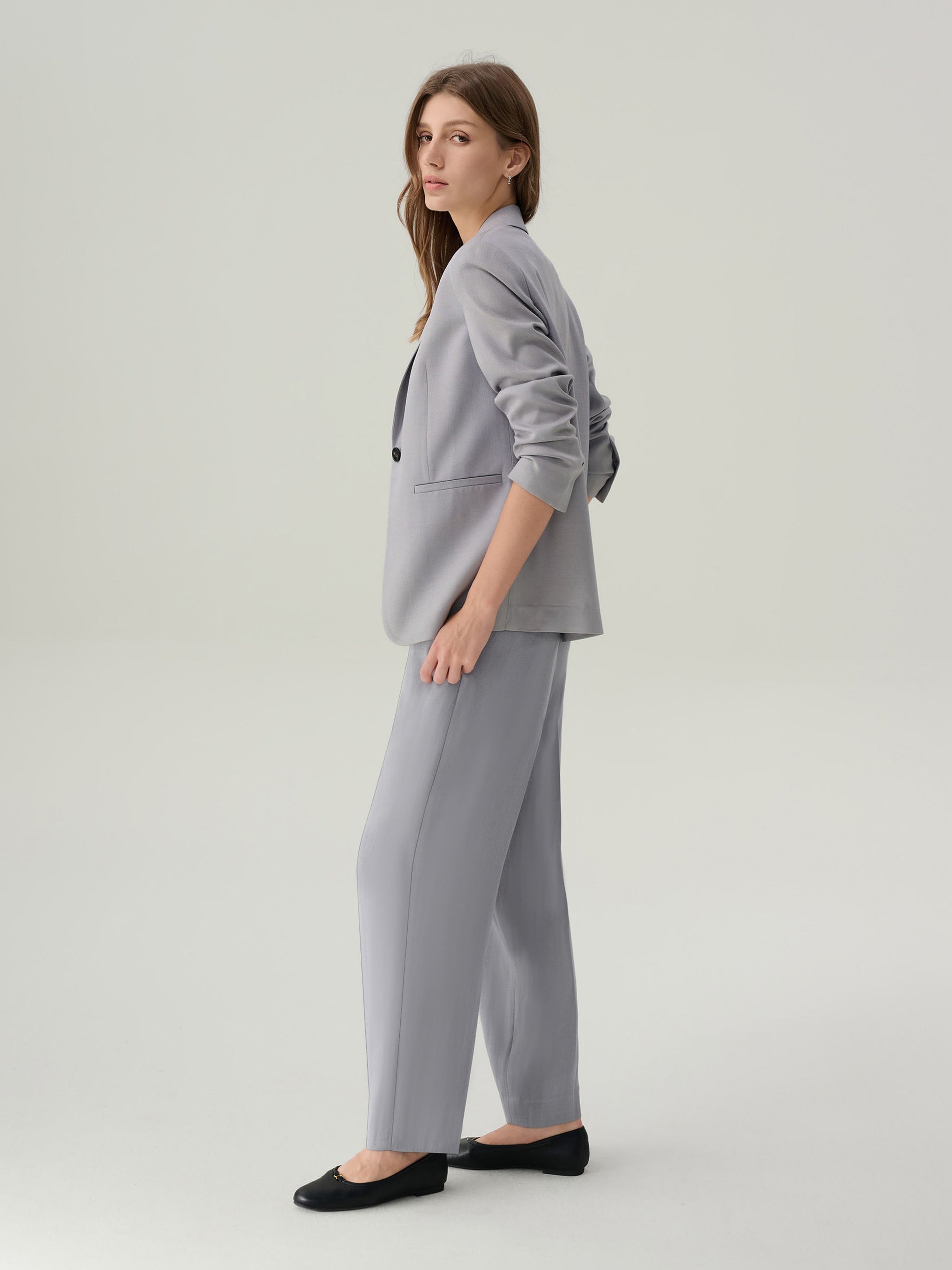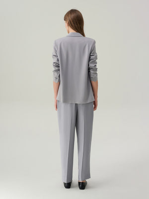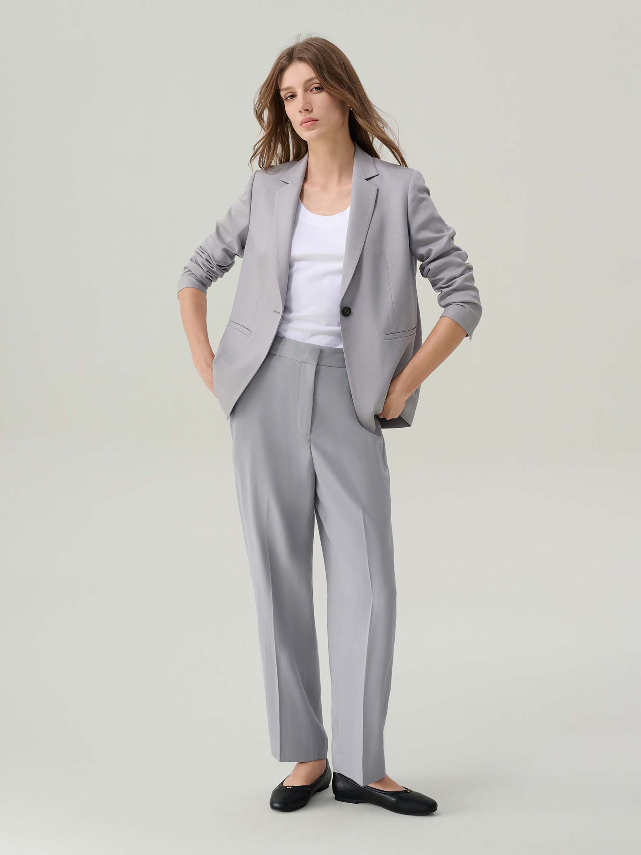 The Elizabeth Rock Grey Suit Jacket blends timeless tailoring with contemporary ease. The single-breasted design features a notched lapel, a single black button fastening, and welt pockets for a clean profile. Lightly padded shoulders and a relaxed fit offer comfort without compromising structure, while the partial lining ensures a refined drape.