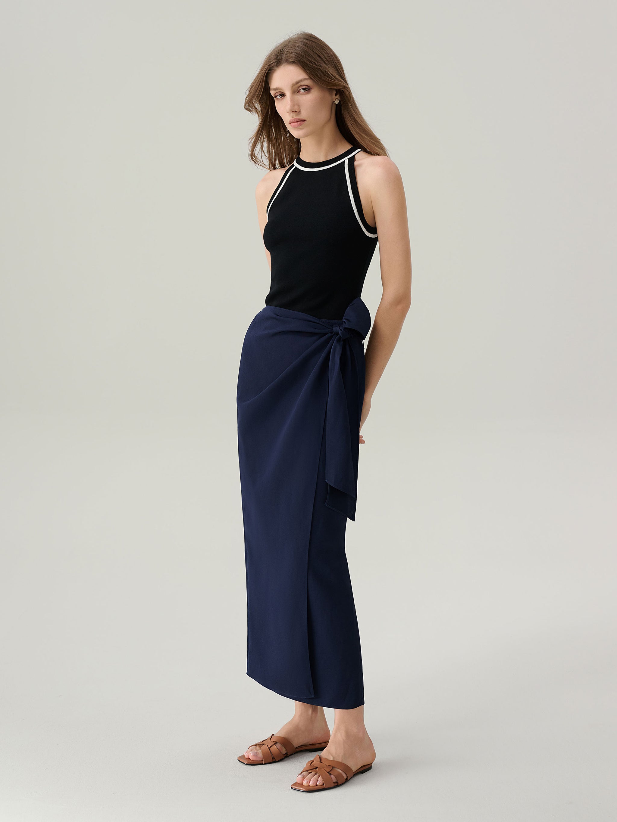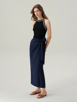 The Pippa Long Wrap Skirt features a classic wrap silhouette with an adjustable self-tie waist for a personalized fit. An asymmetrical hemline adds subtle movement and modern edge, while the wrap design drapes fluidly for an effortlessly refined look.