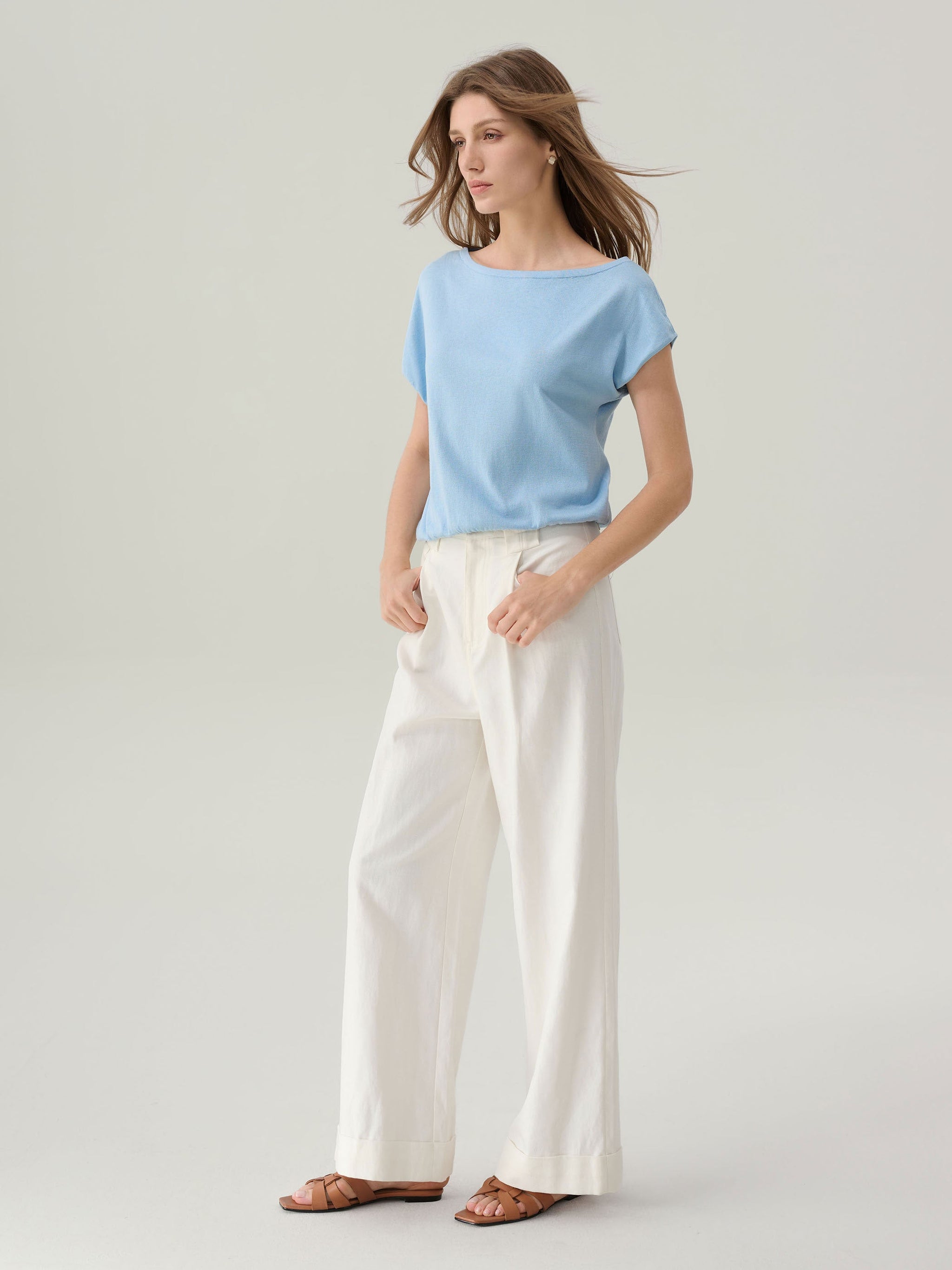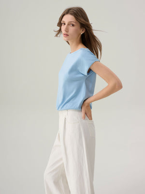 The Lilia Cool Blue Silk Top is a fresh take on everyday elegance, crafted from a soft silk blend in a serene cool blue shade. Designed with a relaxed, easy fit, it features a subtle boat neckline, asymmetrically cut sleeves, and a gently cinched hem that creates a flattering shape. Lightweight and breathable, this top drapes beautifully against the skin, making it perfect for both casual styling and refined layering.