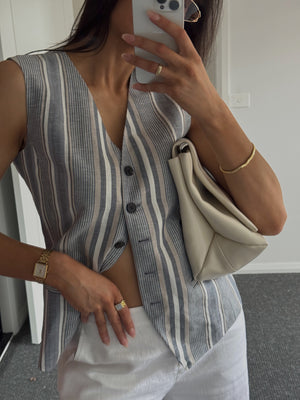 The Joan Striped Linen Vest is a warm-weather must-have, crafted from a breathable linen blend with a refined vertical stripe pattern in soft shades of blue and grey. Designed with a V-neckline and button-front closure, it features asymmetrical front welt pockets for a touch of whimsy. The unlined construction makes this vest highly wearable on its own, while the adjustable back belt provides a customizable fit. Clean lines and lightweight fabric make it a versatile layering piece, perfect for pairing with tailored trousers, denim, or the matching striped shorts for a coordinated summer set.
