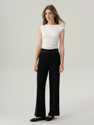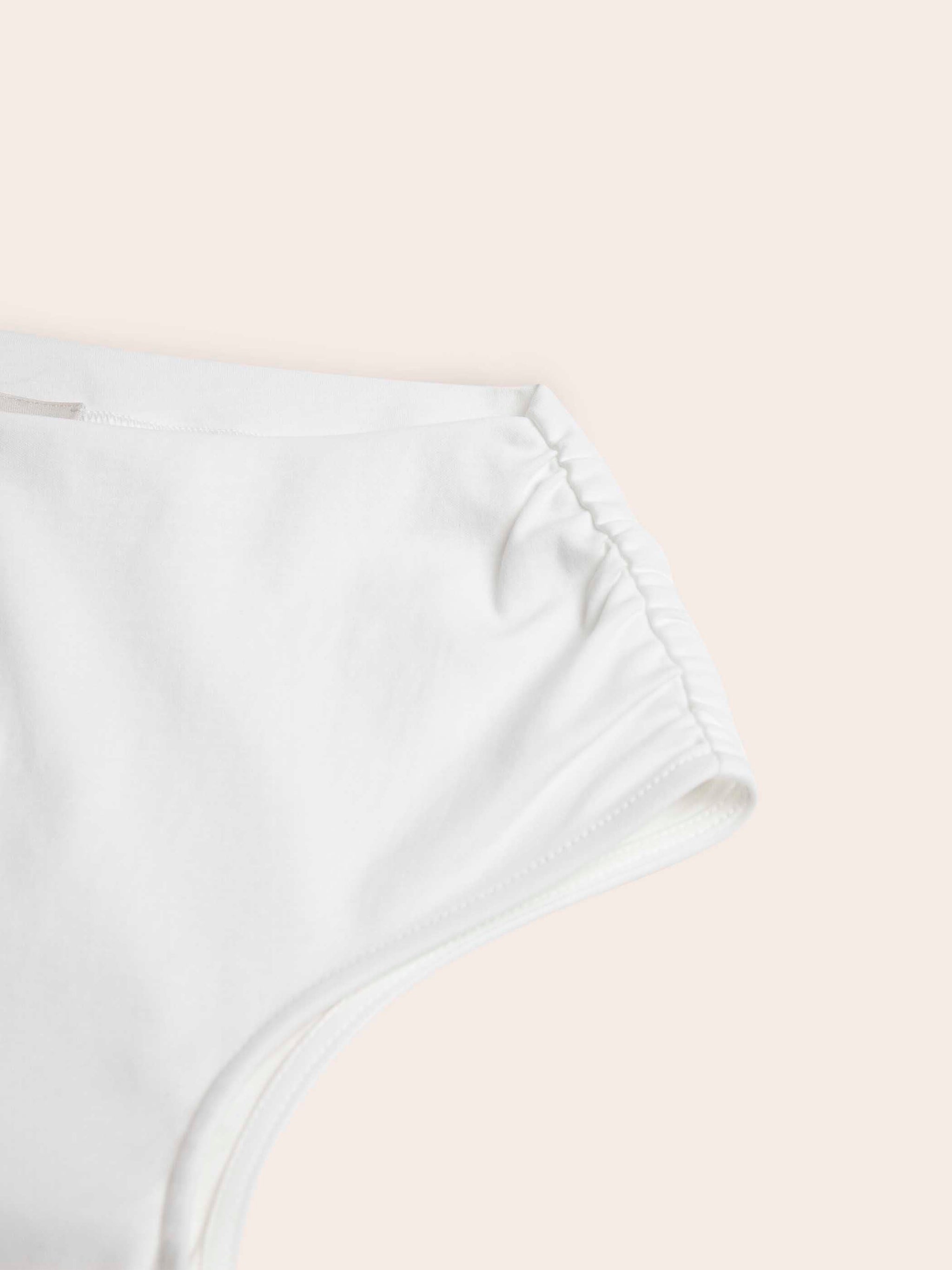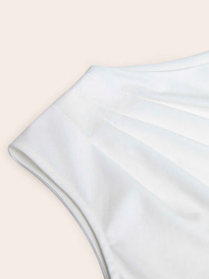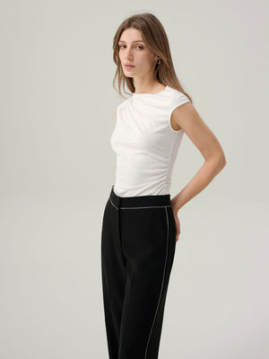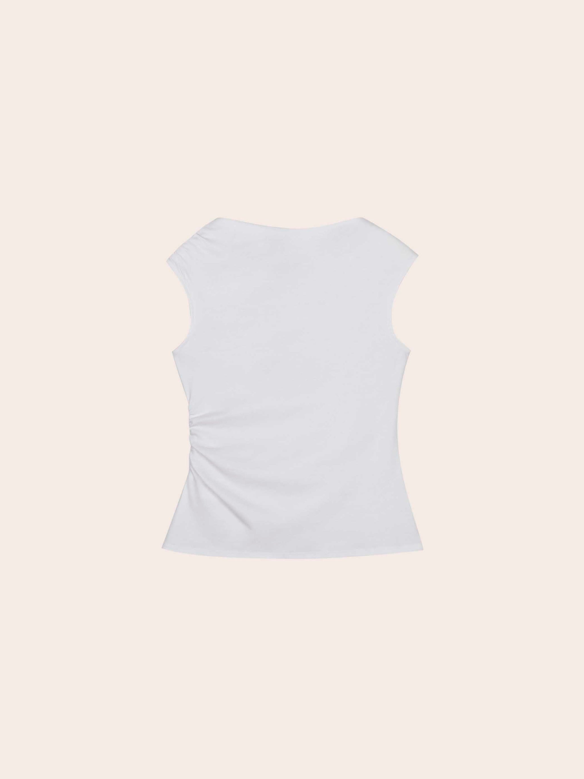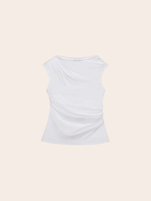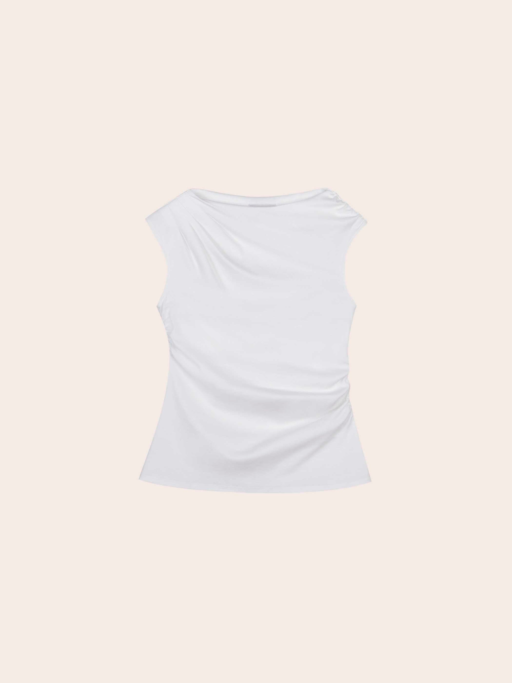 The Rosie Cotton Top features subtle pleating at the shoulders and gentle rushing along the side, creating a naturally draped effect that flatters the silhouette. A clean neckline keeps the look minimal, while the soft stretch fabric ensures ease and comfort for everyday wear. Effortlessly versatile, this piece pairs seamlessly with tailored trousers, denim, or skirts for a refined yet relaxed look.