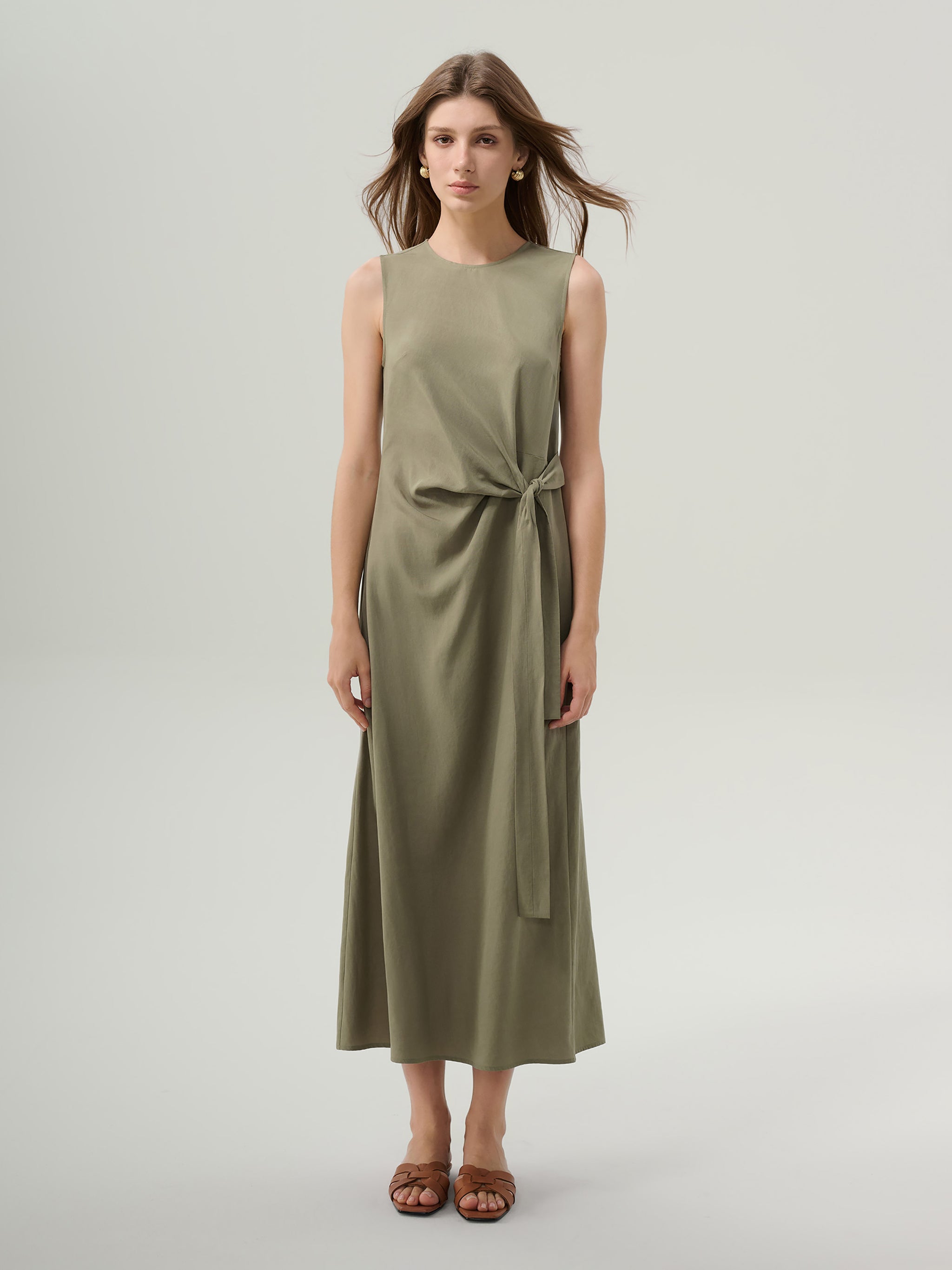 Effortless and flattering, the Tillie Linen Blend Dress is cut from breathable chambray linen with a clean A-line silhouette. A round neckline and wide shoulder straps frame the bodice, while a fixed side tie at the waist creates soft definition along your form. Finished with a back vent for ease of movement and a concealed zip closure, this dress is a warm-weather staple designed for all-day comfort.
