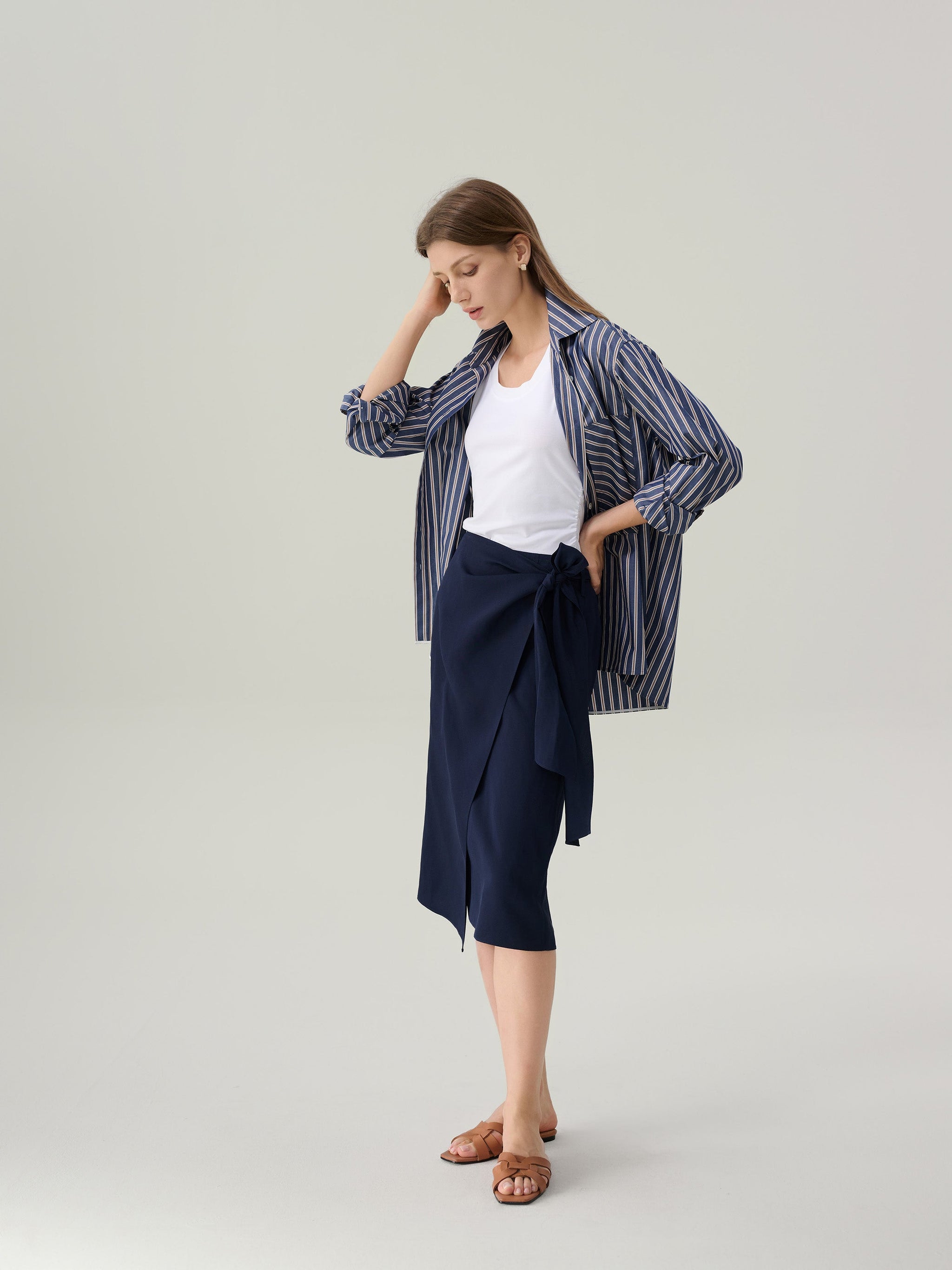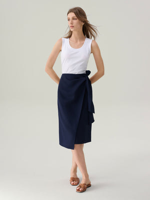 The Kate Wrap Midi Skirt is defined by its asymmetric wrap silhouette and side-tie detail, offering a timeless and sophisticated look. With its soft drape and clean tailoring, this skirt moves easily between polished office styling and relaxed weekend wear. The adjustable tie waist provides a flattering fit, while the wrap front adds comfort and ease of movement. Pair it with a tucked-in blouse for a refined ensemble or a simple tee for a more casual, contemporary feel.
