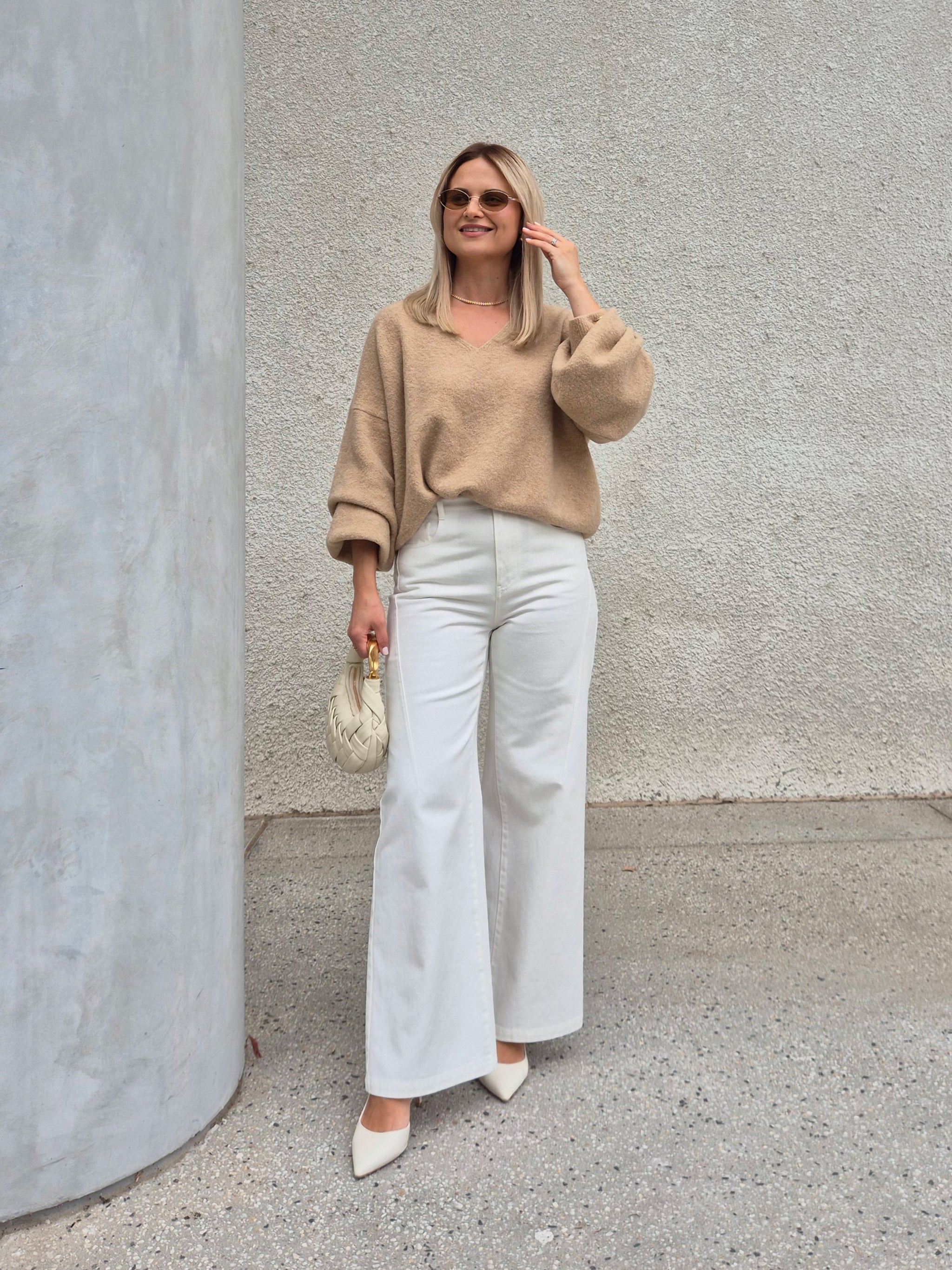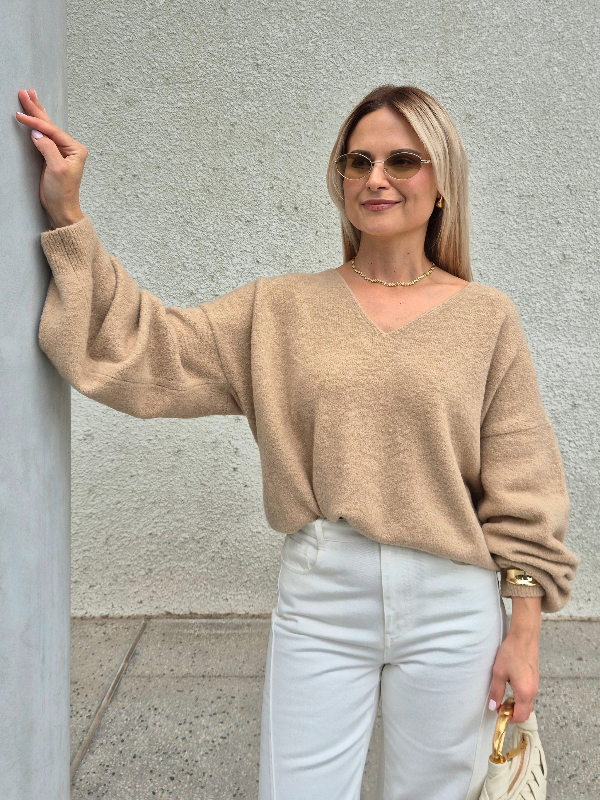 Designed for effortless layering, the Wool V-Neck Sweater features a relaxed fit and ultra-soft texture. The deep V-neckline flatters the collarbone, while dropped shoulders and balloon sleeves add subtle volume and movement. Whether worn off one shoulder for a laid-back look or as a classic V-neck sweater, it offers a balance of casual elegance and modern minimalism.