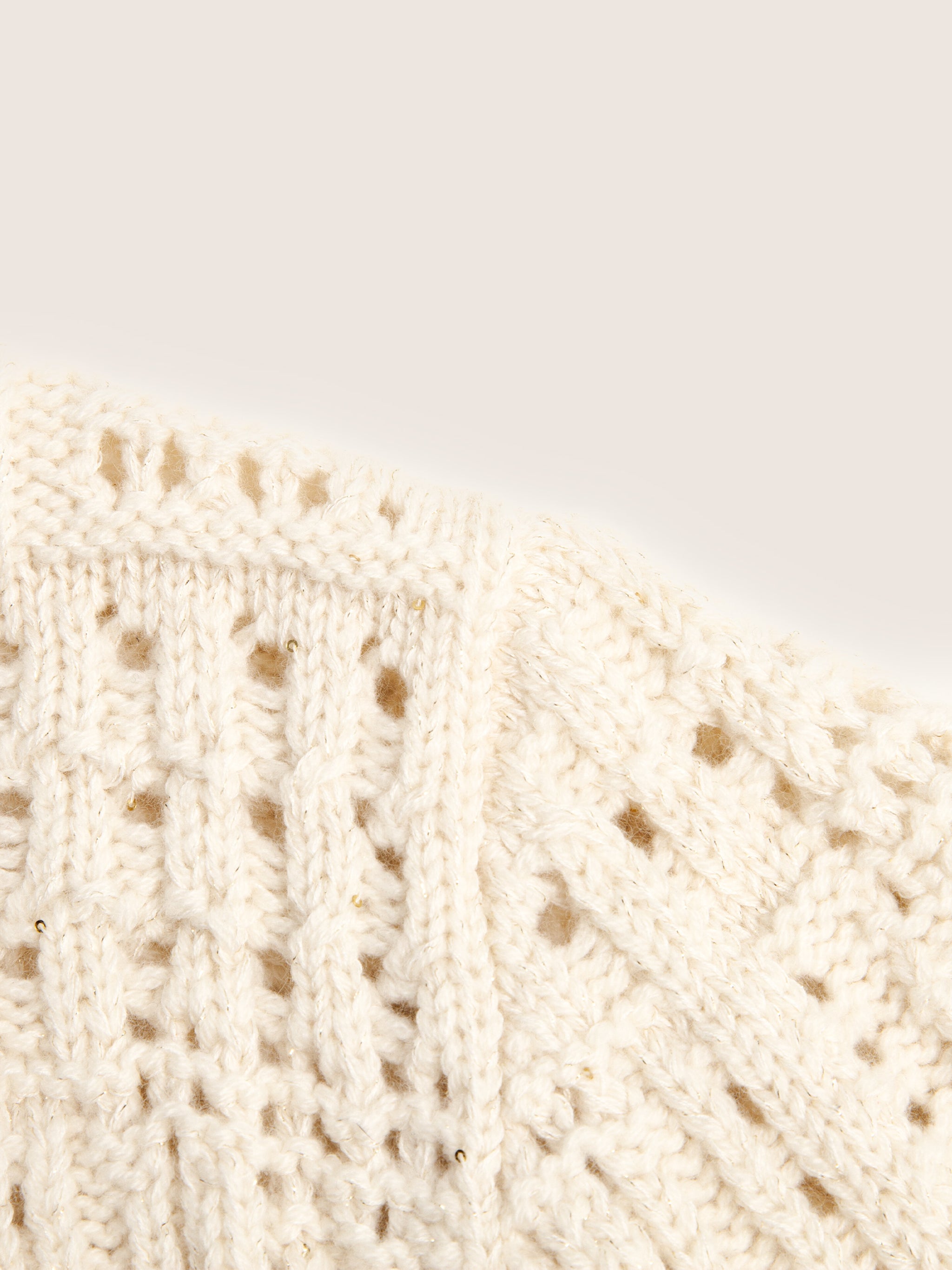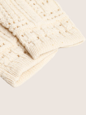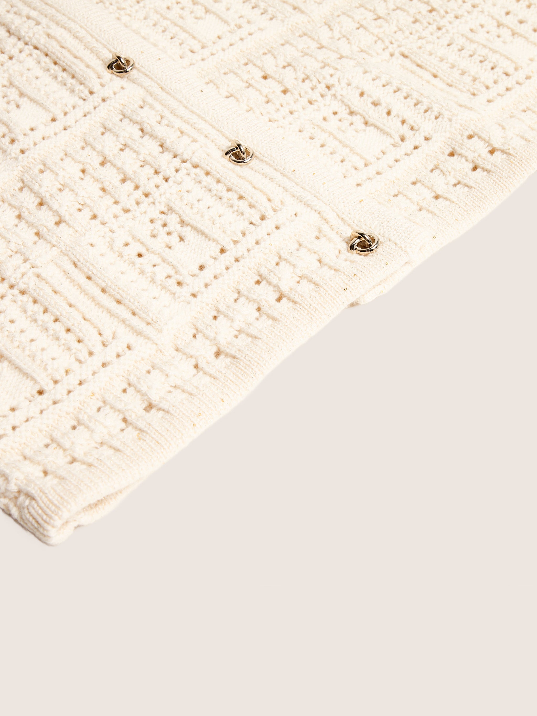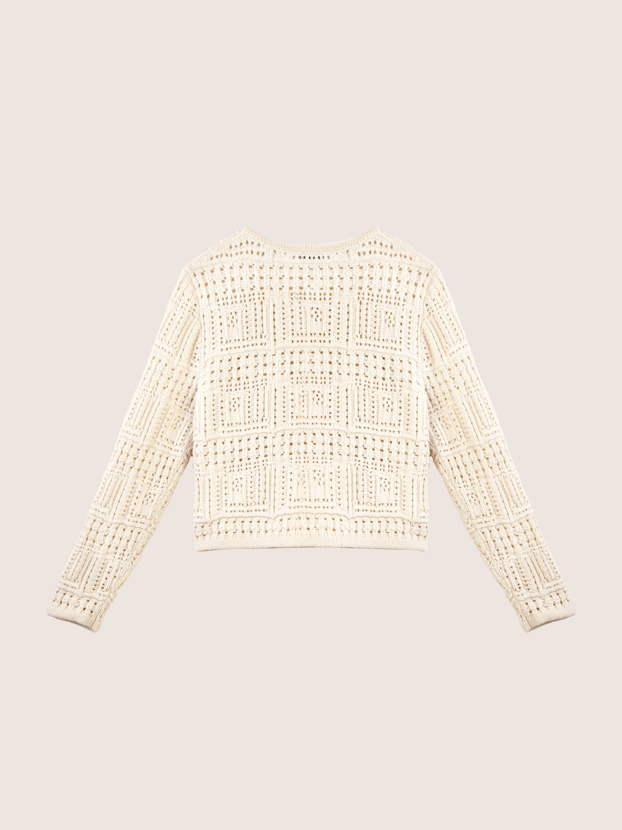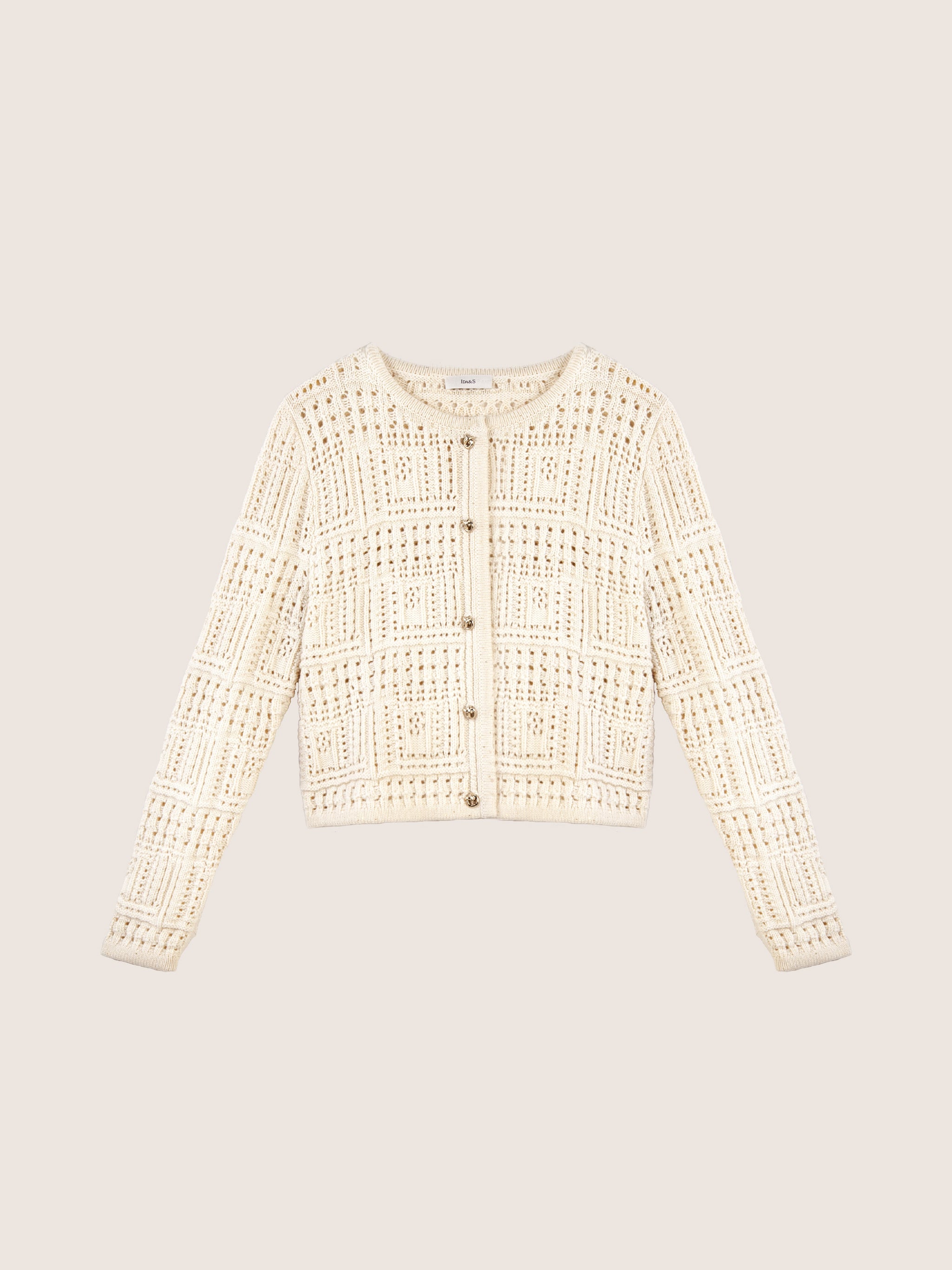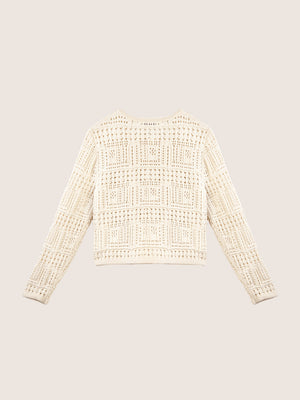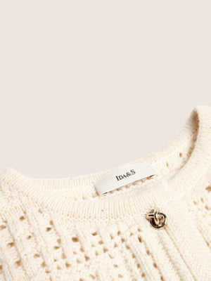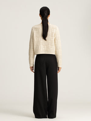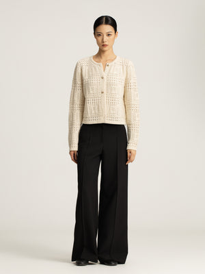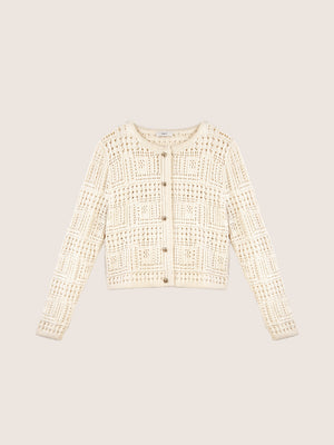 The Thea Cashmere Crochet Cardigan is the perfect statement piece. Crafted in a soft crochet knit with a square lattice pattern, it channels a classic, vintage-inspired look while offering both comfort and structure. The cropped silhouette is complemented by a round neckline and finished with elegant gold accent buttons, making it a refined and sophisticated layering essential.