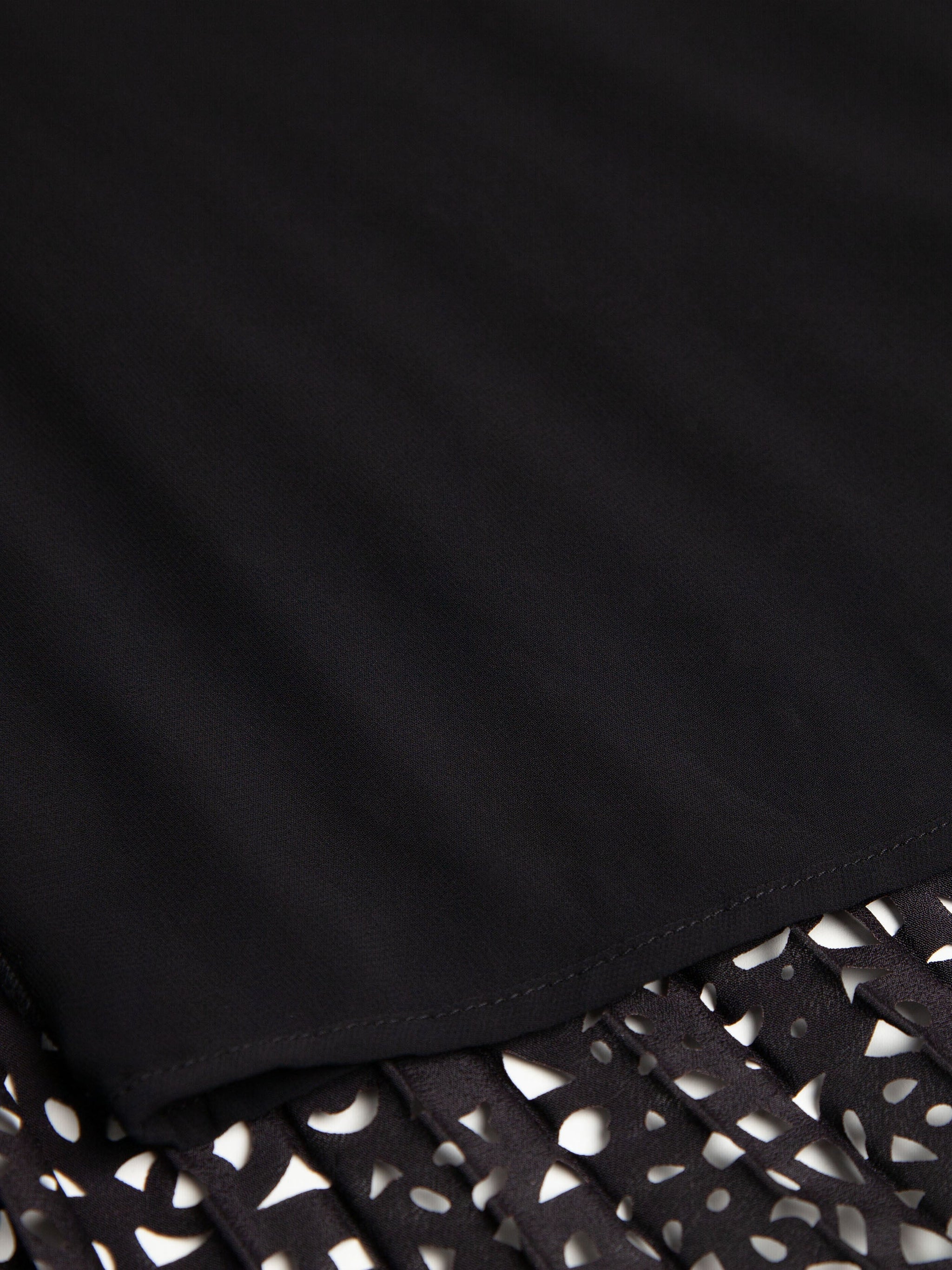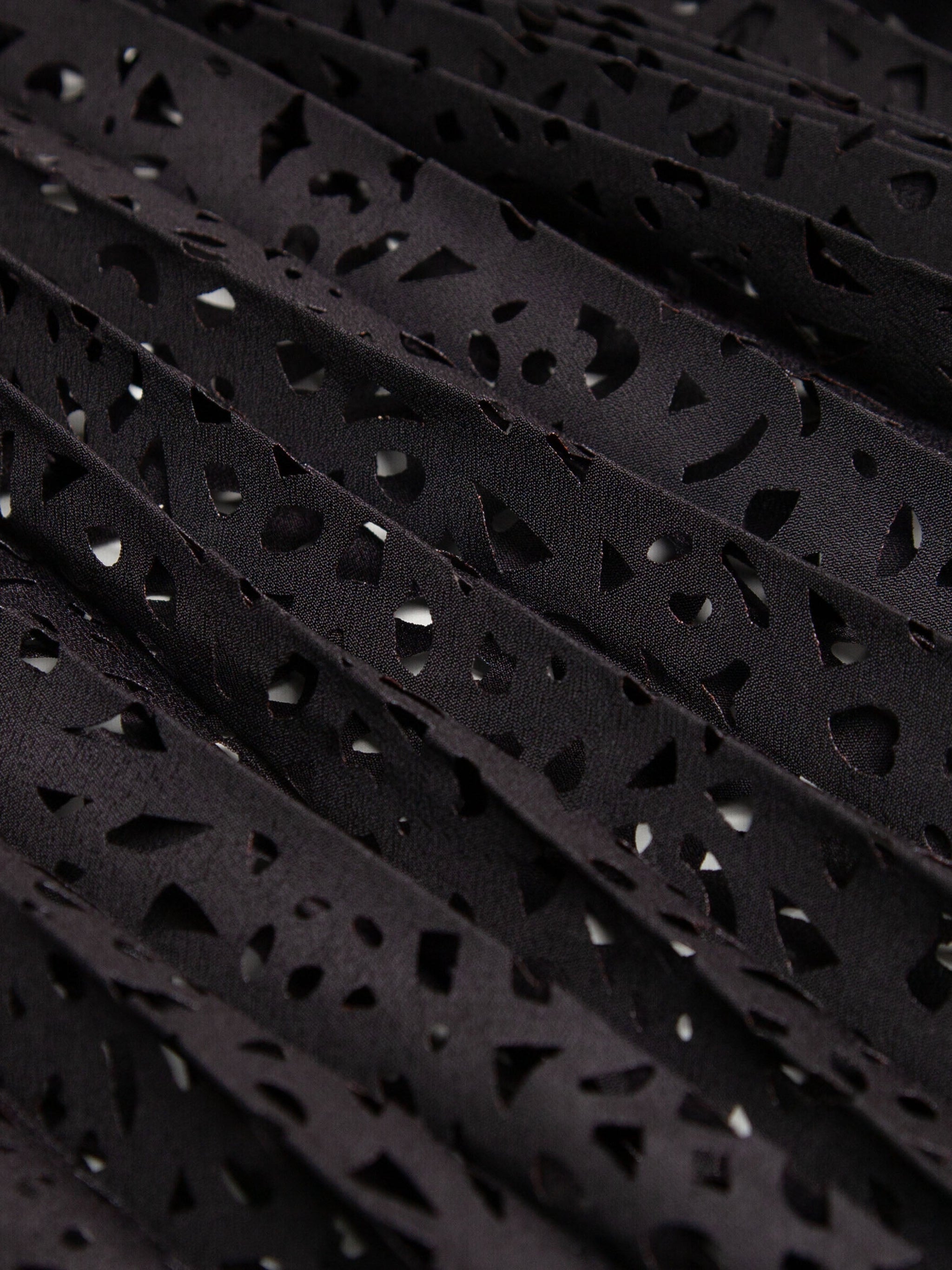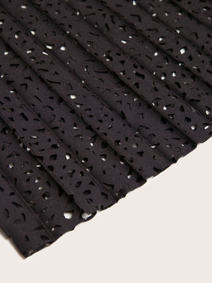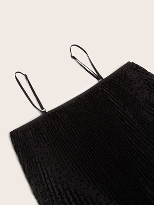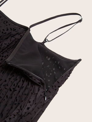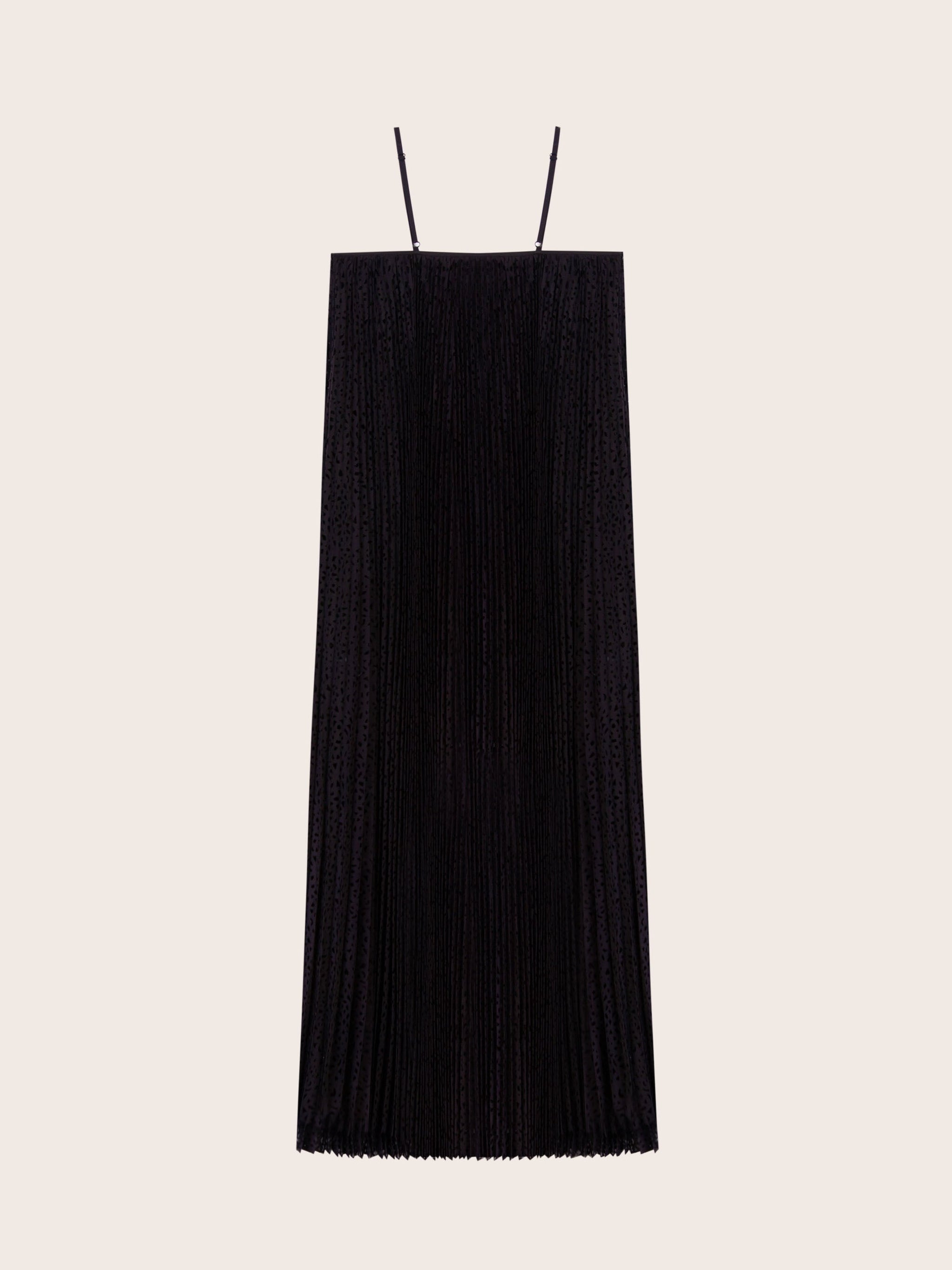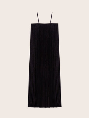 The versatile Zara Black Maxi Dress transitions effortlessly from chic daytime wear to an elegant cocktail look. Designed with adjustable spaghetti straps and a sleek straight neckline, it features intricate laser-cut pleats that create a striking graphic texture. The fluid A-line silhouette moves gracefully with each step, while the soft inner lining ensures comfort against the skin. A discreet side zip adds ease of wear, making this dress a go-to for understated sophistication.